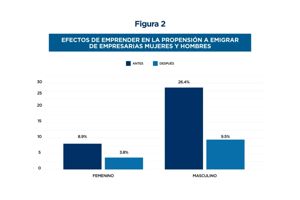 La promoción de emprendimientos como estrategia para reducir las migraciones es eficaz en potenciales emigrantes de ambos sexos, pero tiene un mayor impacto en los hombres que en las mujeres. Un 26.4% de los hombres emprendedores encuestados consideraron migrar antes de iniciar su negocio, frente a únicamente un 8.9% de mujeres emprendedoras. Esto se traduce en una propensión a emigrar tres veces superior en los hombres emprendedores que en las mujeres. Después de establecer el negocio, solo un 3.8% de las mujeres mantiene el deseo de migrar, en comparación con un 9.5% de los hombres (ver figura 4).