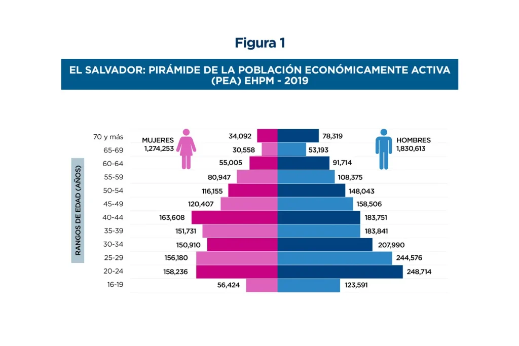 Según datos de la Encuesta de Hogares y Propósitos Múltiples, correspondientes al año 2019, la Población Económicamente Activa del país, conformada por mujeres, asciende a 1,274,253 personas. Una tercera parte de estas mujeres, equivalente al 36.5%, tiene edades entre los 20 y 34 años, como se puede apreciar en la Figura 1.
