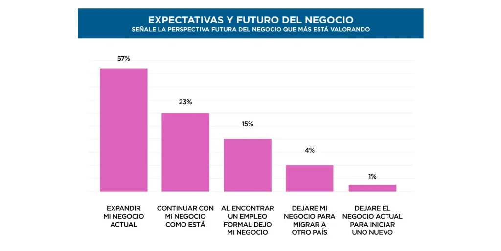 Resulta hasta cierto punto sorprendente que la mayoría desea continuar con sus negocios. El 81% manifestó estar decidida a seguir como empresaria. De estas, el 57% considera expandir su negocio actual, el 23% planea continuarlo como está, y el 1% opinó que dejará el emprendimiento actual para iniciar uno nuevo (ver figura 7).