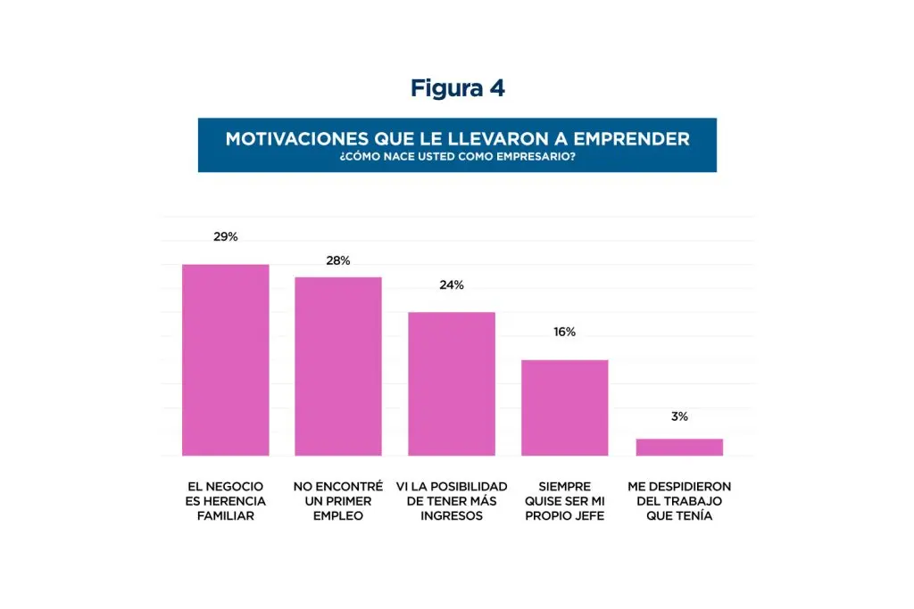 Al preguntarles a las emprendedoras jóvenes sobre sus motivaciones personales para crear un negocio, el 29% se inició como micro o pequeña empresaria por herencia familiar; el 28% no encontró un primer empleo; el 24% lo hizo por la posibilidad de tener mayores ingresos; el 16% por el deseo de ser independiente; y un 3% decidió emprender después de haber sido despedida de su trabajo (ver figura 5).