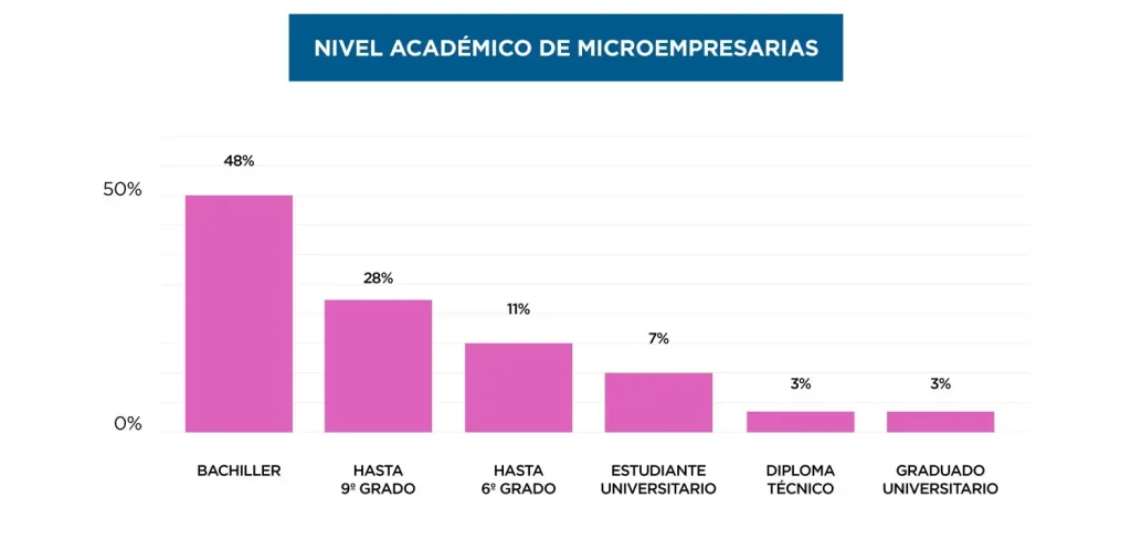 El 48% de las encuestadas logró terminar su Bachillerato; el 28%, hasta 9º grado; el 11% completó el sexto grado; el 3% ha obtenido formación a nivel Técnico; y un 3% ha obtenido algún grado universitario (ver figura 3). Resulta interesante el hecho de que, a medida que la MYPE crece de tamaño, el nivel de estudio es comparativamente mayor, mientras que en las MYPES de subsistencia el nivel educativo es menor (*2). Esta correlación entre el tamaño de la MYPE y el nivel de estudio destaca cómo el nivel de educación es un predictor del crecimiento y éxito potencial de los empresarios de la MYPE que desean crecer y desarrollar sus negocios.