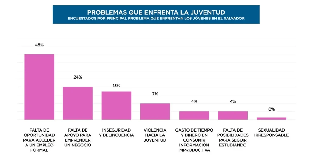 Con el propósito de conocer la percepción de las encuestadas respecto al principal problema que, según ellas, enfrentan los jóvenes en general en El Salvador, el 45% señaló la falta de oportunidades para acceder a un empleo formal como la principal dificultad, seguido por un 24% que mencionó la falta de apoyo para emprender un negocio, y un 15% que destacó la inseguridad como uno de los tres principales problemas. En menor escala, un 7% identificó la violencia hacia la juventud, un 4% mencionó el gasto de tiempo y dinero en el consumo de información improductiva, y un porcentaje igual señaló la falta de oportunidades para continuar estudiando (ver figura 6).