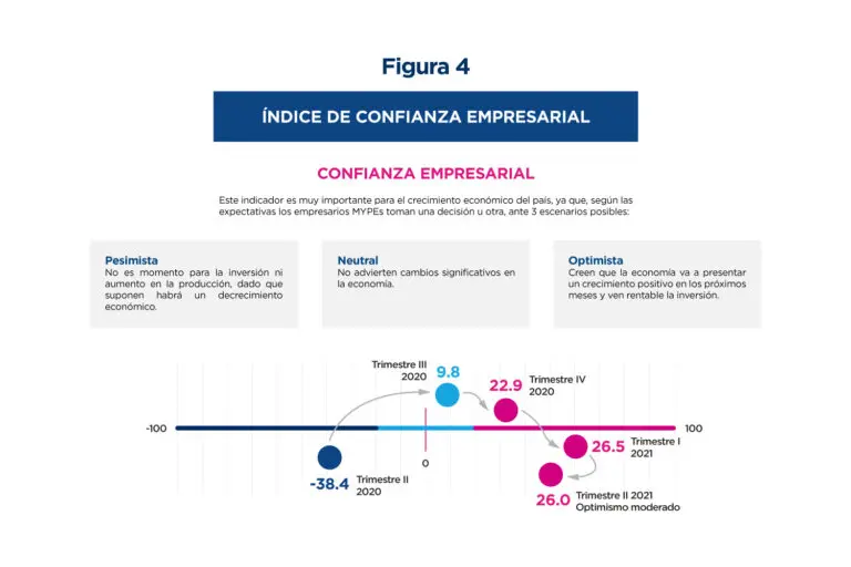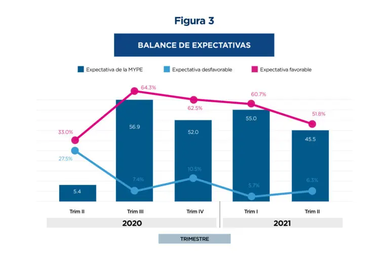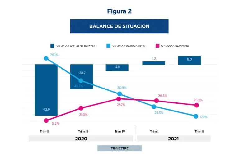 La cantidad de empresarios encuestados que opinaron haber tenido un trimestre II 2021 favorable con respecto al trimestre I del mismo año fue de 25.2%, y los que opinaron que fue desfavorable ascendió a 17.2%; ambos porcentajes combinados se traducen una situación económica de la micro y pequeña empresa que pasa de 1.2 del trimestre anterior a 8.0 en el trimestre II 2021.