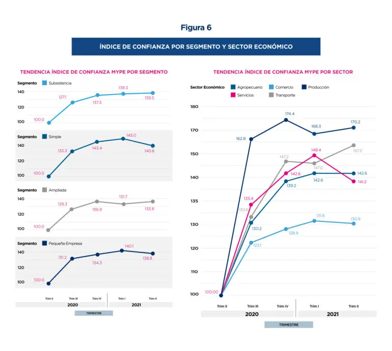 El indicador de confianza empresarial muestra un puntaje de alrededor de 140.0 a partir del primer trimestre 2021, equivalente a un crecimiento del 40% con respecto al periodo base junio 2020 que marca el momento más crítico del confinamiento respecto al desempeño de la economía en general.