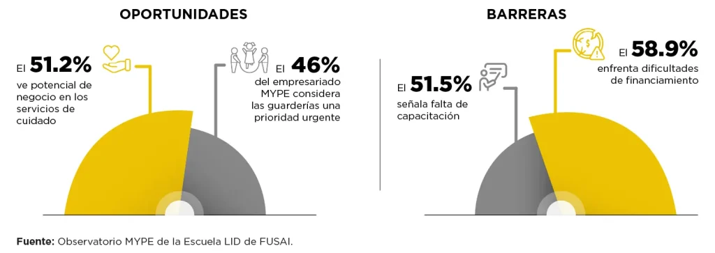 La evidencia revela una oportunidad latente: el 46% del empresariado MYPE identifica las guarderías como prioridad urgente, mientras que el 51.2% visualiza posibilidades de incursionar en servicios de cuidado. Sin embargo, las barreras de financiamiento (58.9%) y capacitación (51.5%) mantienen este potencial congelado. El mercado existe y la demanda es clara, lo que representa una oportunidad estratégica para una respuesta institucional efectiva que libere este potencial latente.
