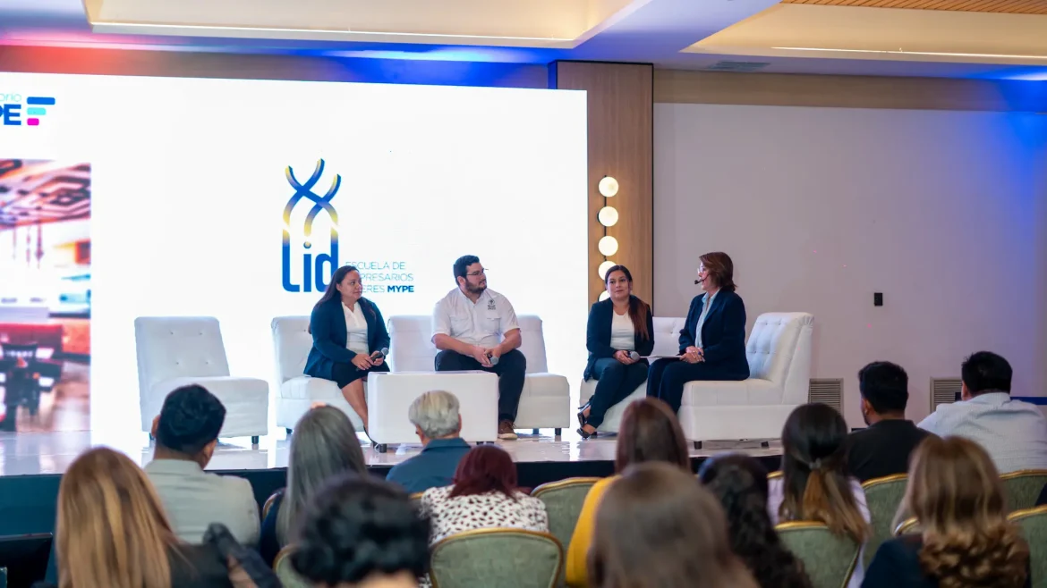 Saraí Benítez (La Conchagüeña), Tito Ventura (Rusticanto) y Rosmery Muñoz de Ramírez (La Casita de Eli), empresarios participantes del conversatorio del Informe MYPE 2025, moderado por la Licda. Claudia Dueñas, gerente de la Escuela LID.