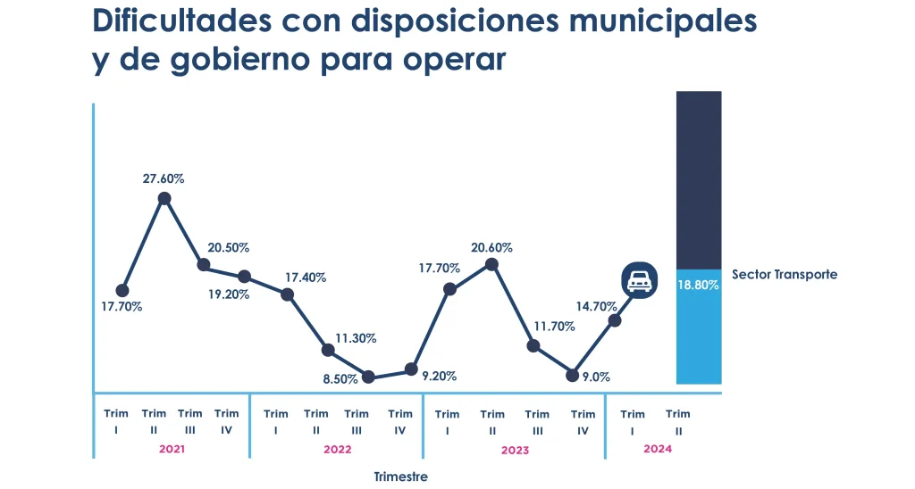 Es importante resaltar que, para el segundo trimestre de 2024, las regulaciones municipales y gubernamentales también han impactado significativamente al sector transporte, por tercer trimestre consecutivo. En este período, el 18% de los empresarios reportó dificultades relacionadas con la normativa. Este aumento en los desafíos regulatorios podría sugerir la necesidad de una mejor colaboración entre el sector y el Gobierno para crear políticas que beneficien a los empresarios sin entorpecer sus operaciones. “El IVA y otros impuestos nos afectan significativamente”, comenta Dalila. “A veces, el margen de ganancia apenas cubre los costos”.
