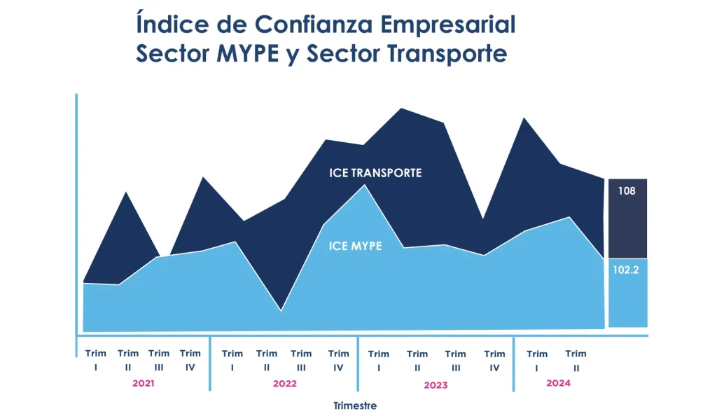 En el trimestre correspondiente a los meses de abril hasta junio de 2024, el Índice de Confianza Empresarial para el sector transporte cerró en 108, posicionándolo como el segundo sector con mejor desempeño, con un puntaje superior al promedio obtenido por todo el sector MYPE.
