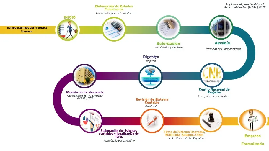 Considerando que para créditos por arriba de los US$30,000, con la nueva Ley de Acceso para Facilitar el Crédito, las empresas o personas solicitantes deberán estar legalmente constituidas, es decir haber completado el proceso de legalización de sus empresas o actividades profesionales o técnicas, se presenta a continuación una guía informativa de los pasos que conlleva dicho proceso de formalización.