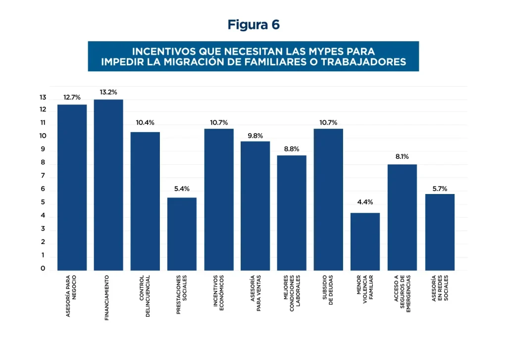 6. Existe una diversidad de incentivos a través de los cuales se puede apoyar a las MYPES. Contrario a la creencia de que el único incentivo que necesitan es el acceso a financiamiento, la encuesta refleja que se les puede apoyar mediante una variedad de instrumentos, tales como: asesoría para los negocios, subsidio de deudas, incentivos económicos, asesoría para ventas, mejores condiciones laborales, acceso a seguros para emergencias, asesoría en redes sociales, acceso a prestaciones sociales, entre otros (ver figura 6).