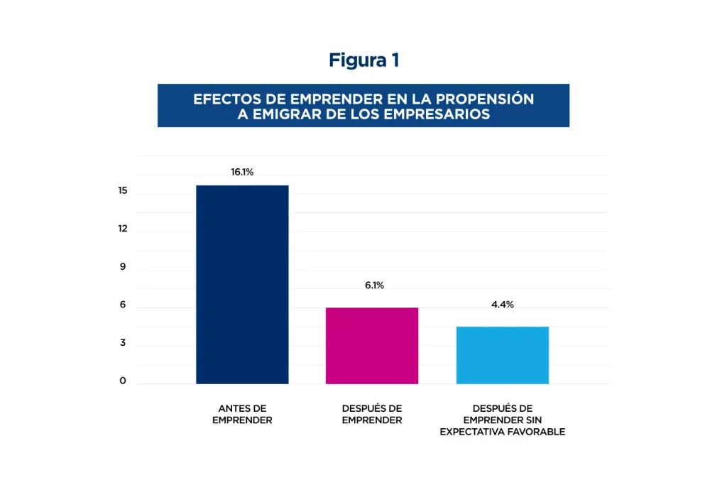 1. De acuerdo con los resultados de la encuesta, la promoción de las MYPES es una de las estrategias más eficaces para desestimular la migración. Antes de emprender, un 16.1% de los empresarios encuestados consideraba la posibilidad de migrar. Sin embargo, luego de iniciar su emprendimiento, este número se redujo a un 6.1%. Esto significa que, en promedio, establecer una MYPE disuade el deseo de emigrar en casi un 70% de los emprendedores, lo cual es altamente significativo (ver figura 1).