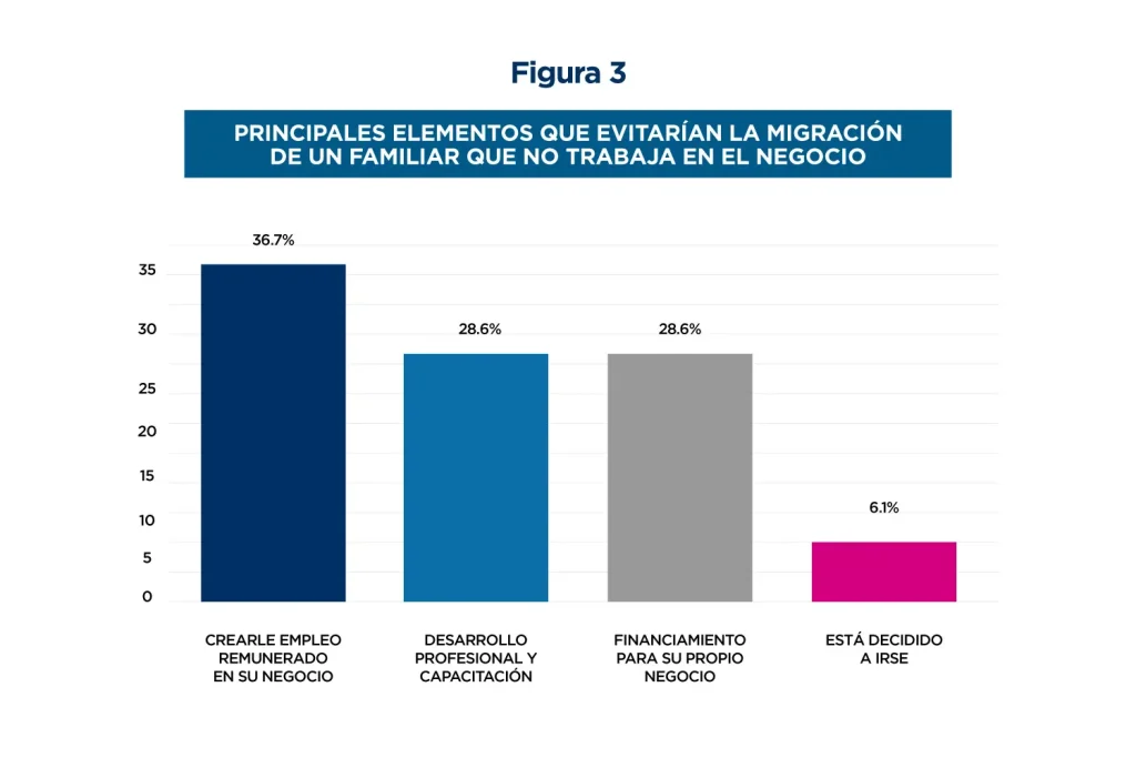 3. Generar un ecosistema favorable para expandir el tamaño de las MYPES es también una estrategia eficaz para reducir las migraciones. Entre los emprendedores encuestados, un 12.7% afirma tener un familiar que no trabaja en su negocio y ha considerado emigrar. De estos emprendedores, un 36.7% considera que el principal factor que podría evitar la emigración de su familiar es la creación de un empleo remunerado, seguido de las posibilidades de acceder a mayor financiamiento y a oportunidades de desarrollo profesional y capacitación (28.6% en ambos casos). De hecho, entre aquellos que tienen parientes con deseos de emigrar, únicamente el 6.1% cree que la persona está decidida a irse, lo cual evidencia un amplio margen para evitar nuevas migraciones (ver figura 3).