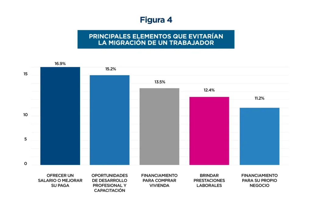 4. Mejorar las condiciones laborales de los trabajadores de las MYPES desestimula su interés en emigrar. El 11.9% de los emprendedores encuestados expresa que en su emprendimiento laboran trabajadores que están considerando emigrar. Sin embargo, también consideran que la inmensa mayoría desistiría de ese proyecto por las siguientes razones, en orden de importancia: un 16.9% mencionó un mejor salario; un 15.2%, desarrollo profesional y capacitación; un 13.5%, acceso a financiamiento para la compra de vivienda; un 12.4%, mayores prestaciones laborales; y un 11.2%, acceso a financiamiento para poner su propio negocio. Como se puede observar, en este ámbito se requiere un enfoque multidimensional e integral para mejorar las condiciones de vida de los trabajadores de las MYPES (ver figura 4).