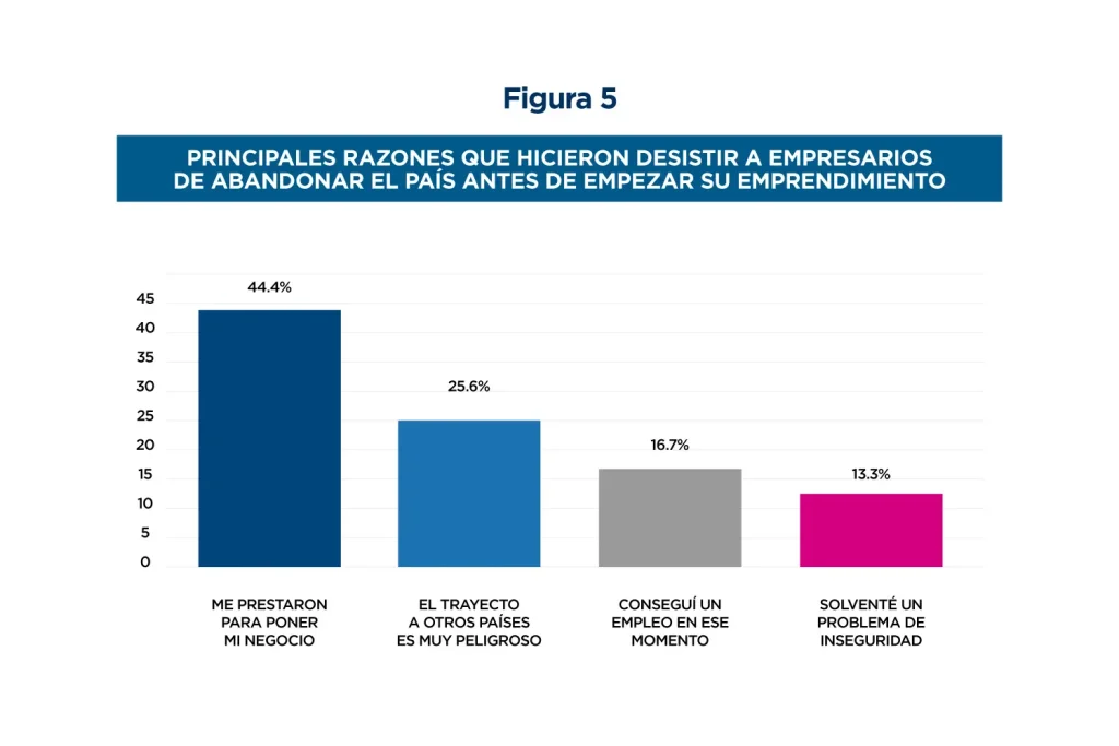 5. El acceso a crédito para iniciar un negocio es fundamental para evitar la emigración de potenciales emprendedores. De los propietarios de MYPES que consideraron abandonar el país antes de emprender, un 16.1%, un 44.4% afirma que la principal razón que les hizo desistir fue el acceso a crédito para iniciar su negocio (ver figura 5).