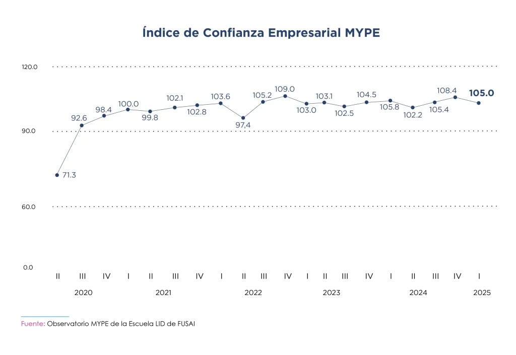 El primer trimestre de 2025 cerró con un Índice de Confianza Empresarial (ICE) de 105 puntos para las MYPES salvadoreñas, una leve caída de 3.5 puntos respecto al cuarto trimestre de 2024, pero alineado con los niveles históricos del sector. Esta baja responde a un patrón recurrente: el impulso estacional de fin de año da paso a una desaceleración natural al iniciar el nuevo periodo fiscal.