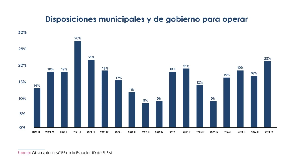 A los desafíos internos se suma un obstáculo externo cada vez más citado por los empresarios: la burocracia regulatoria. Para el cierre de 2024, uno de cada cuatro empresarios del sector transporte reportó haber sido afectado por normativas municipales o gubernamentales. Este dato representa un incremento de 9 puntos frente al trimestre anterior y se sitúa 10 puntos por encima del promedio del sector MYPE.