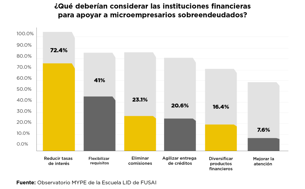 Según el estudio, el 72.4% de los microempresarios señala la reducción de tasas de interés como el principal elemento que debería incorporarse en un producto de rescate (Hay que considerar que actualmente con los usureros pagan hasta 2,000% anual). Le siguen la flexibilización de requisitos (41%), la eliminación de comisiones (23.1%), la agilización en la entrega de créditos (20.6%), la diversificación de productos (16.4%) y, en menor medida pero no menos importante, una mejora en la atención (7.6%).