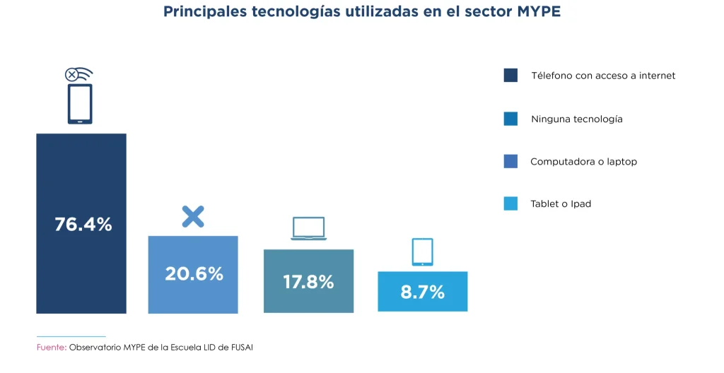 A pesar de representar el 70% del empleo del país, las MYPE salvadoreñas operan en un contexto de rezago tecnológico. Según el estudio El Estado de la MYPE 2023, elaborado por el Observatorio MYPE de FUSAI, un 76.4% de los empresarios utiliza únicamente su teléfono móvil para gestionar su negocio, mientras que un 20.6% no emplea ninguna tecnología digital.
